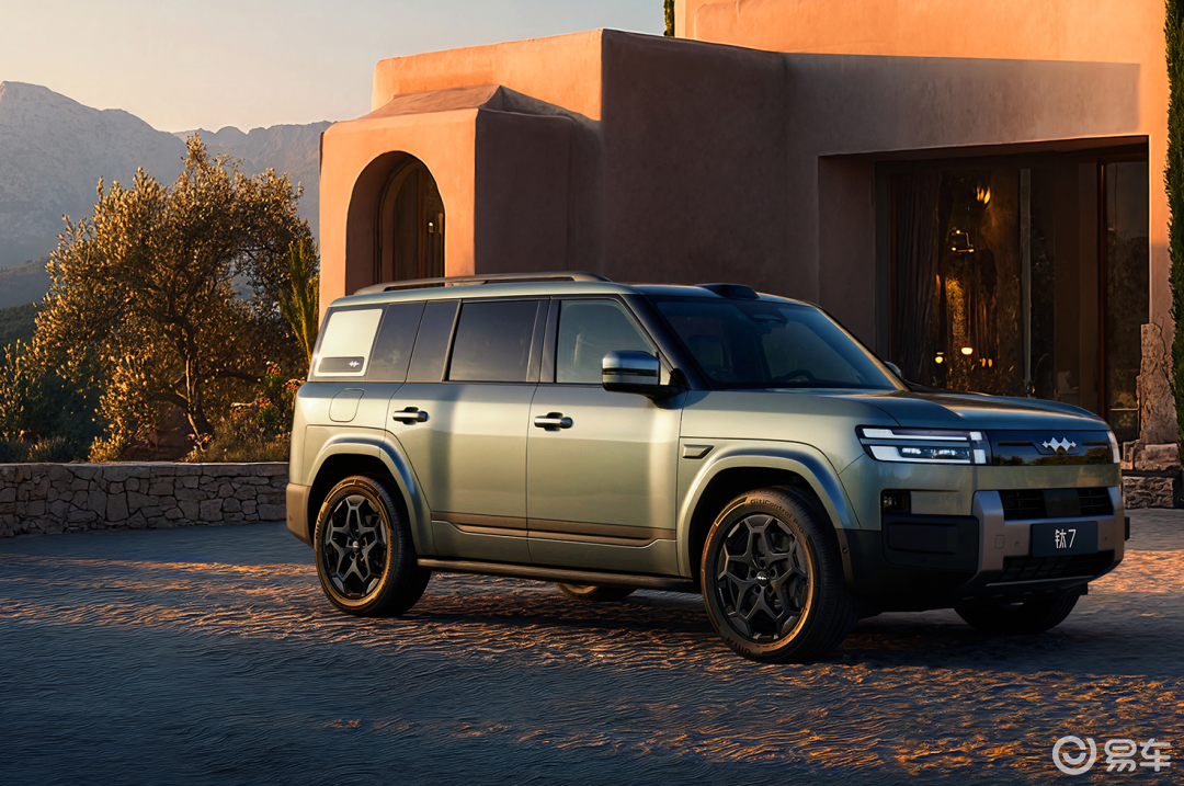 方程豹钛7的外观延续了“方盒子”的硬派造型,但未采用非承载式车身,而是承载式车身结构,更偏向城市驾驶的舒适性和燃油经济性,当然经典的外挂式小书包造型以及粗犷的保险杠让它看上去很唬人,长宽高分别为4999/1995/1865mm,轴距为2920mm,接近角/离去角分别为24/25度。内饰就不太硬派了,采用四辐式多功能方向盘、15.6英寸中控屏、12.3英寸仪表,配备4.5L的车载冷暖箱以及全车座椅加热/通风。动力搭载1.5T插混系统,其中发动机最大功率115kW,两驱版电机功率200kW,双电机四驱版为360kW,提供26.6kWh和35.6kWh电池组,CLTC纯电续航分为135km、190km、200km三种版本,满油满电综合续航超1300km,辅助驾驶方面提供DiPilot 100和带激光雷达的DiPilot 300(顶配)两种方案。