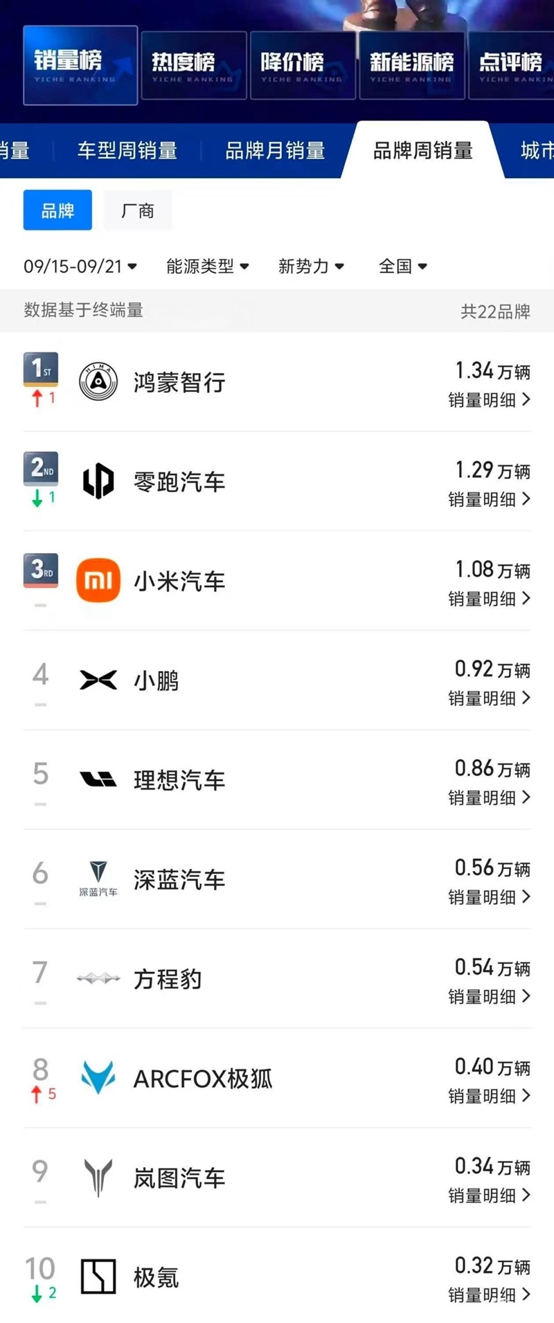 与此同时,方程豹的另一款明星车型豹5也跻身周销量TOP10。方程豹品牌共三款车型强势杀入榜单前10,展现了其强大的市场号召力和品牌影响力。在新势力品牌周销量榜中,方程豹品牌更是位列TOP7,成绩斐然。