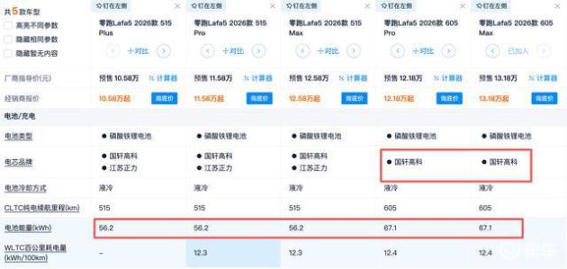 此外,动力电池方面,Lafa5与B01的电池能量规格相同,均为56.2KWH和67.1KWH的磷酸铁锂电池。不同之处在于,B01的67.1KWH电池电芯供应商是宁德时代,而Lafa5的电芯供应商为国轩高科。