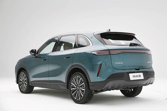 侧面造型,全新奇瑞瑞虎8的虎款和豹款保持一致,均配备半隐藏式门把手,并配备相同样式的19英寸轮圈。而车尾换装了全新样式的贯穿式尾灯,“CHERY”标识位于尾灯上方,整体造型更加饱满圆润。细节方面,两款车型下包围有所区别,分别采用隐藏式排气和双边共两出式排气装饰。尺寸方面,新车的长宽高分别为4749/1880/1710mm,轴距为2825mm,定位中型SUV。