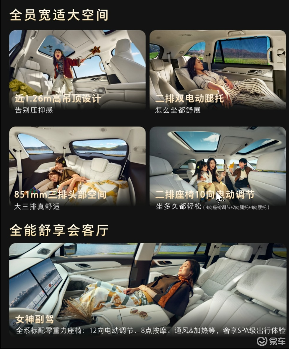 新车坚守“车内无主次”理念,践行舒适平权。主驾八点按摩、副驾一键零重力模式、二排带腿托“头等舱”座椅、成人可坐可躺的第三排,搭配-6℃至50℃的7L豪华大冰箱,让豪华体验覆盖每一位家人。