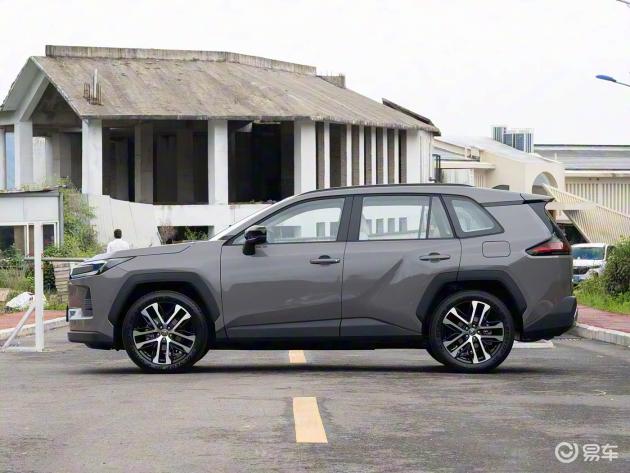 接下来,我们来看车身侧面。车身尺寸为4600mm×1855mm×1680mm,轴距2690mm,经典的SUV比例带来协调的视觉感受。侧身线条借鉴了电动陆巡的硬朗风格,凹凸曲面的车门与外扩轮拱勾勒出饱满的肌肉感,车轮与车身高度比约为0.43,整车姿态稳健扎实。18英寸熏黑轮毂搭配235/60 R18轮胎,厚胎壁设计增强了滤震性和降低了爆胎风险,兼顾美观与实用性。外后视镜支持电动调节、加热和自动折叠功能,雨雪天气可快速清除镜面雾气,窄路停车时避免刮蹭,细节设计体现了丰田对用户需求的深刻洞察。