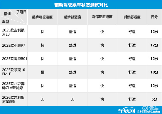 在辅助驾驶跟车状态测试对比中,除领克10 EM-P和银河星耀6以外,其余车型均获得满分,起步和刹停过程中的响应速度和舒适度都能令人满意。其中,领克10 EM-P的失分原因在于起步阶段响应速度较慢,而银河星耀6则由于不支持自动跟车起步功能,因此在起步响应速度和起步舒适度两项未获得分数。