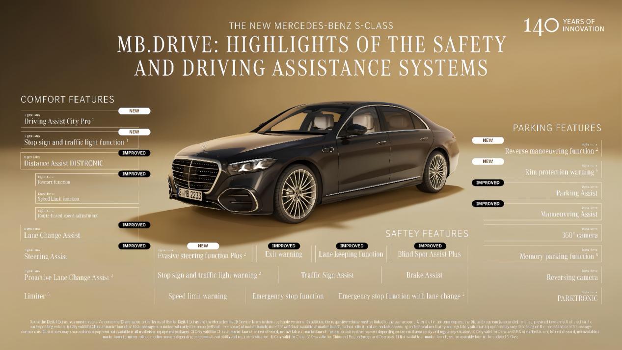 新款S级基于奔驰自研的MB.OS架构打造,实现了整车软硬件资源的深度整合。智能座舱支持零层级交互界面、沉浸式导航以及AR平视显示功能。智能驾驶辅助系统依托由10个外部摄像头、5个雷达传感器以及12个超声波传感器组成的感知硬件阵列。
