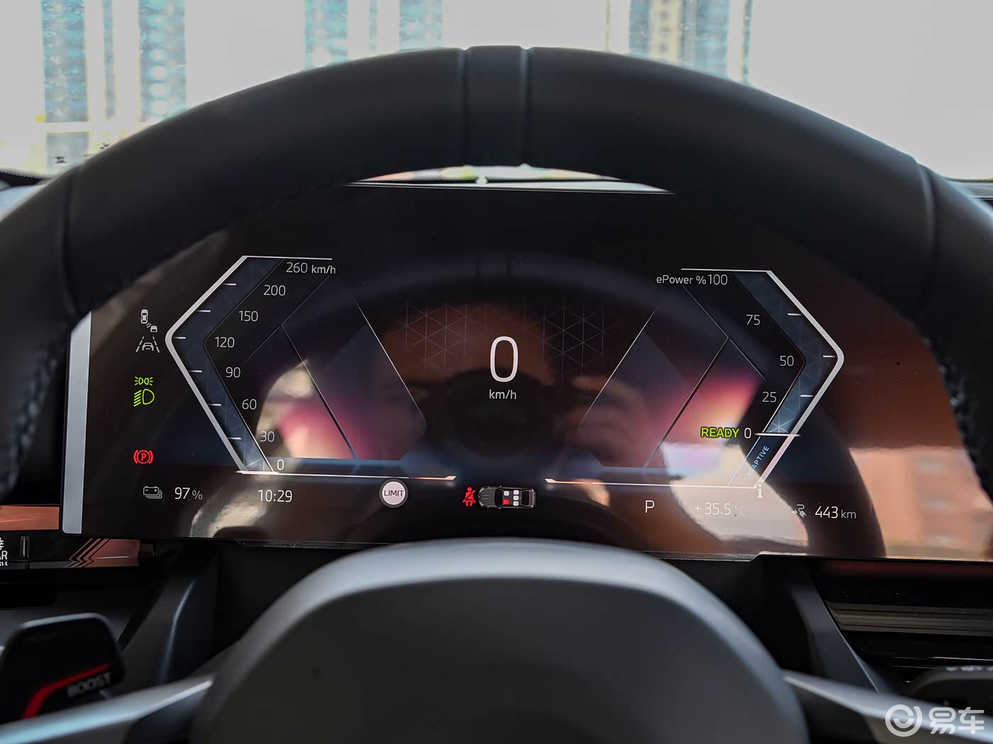 车内部分,2026款宝马i5的同样沿用家族式设计,中控台微微偏向驾驶员一侧,并提供有双幅式多功能方向盘、曲面双联屏(12.3英寸全液晶仪表+14.9英寸中控屏)以及拨杆式电子档把,中高配版本均提供了HUD抬头显示系统,车机内置高通骁龙8155P芯片,在多色氛围灯的呼应下,营造出不错的科技感和时尚感。
