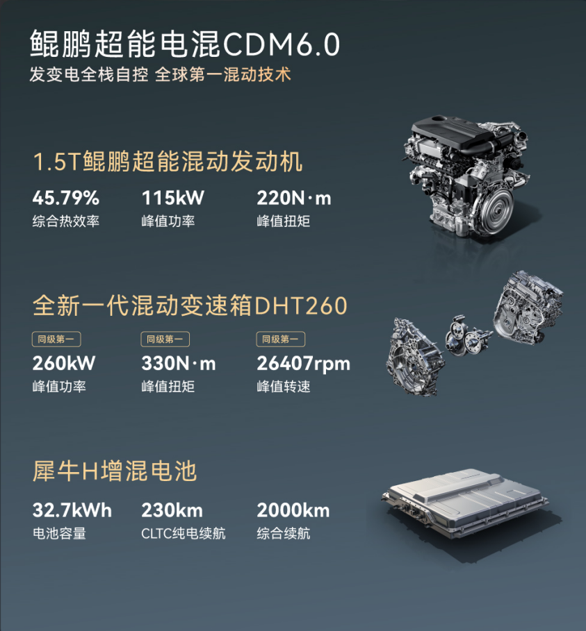 风云T9L搭载的是鲲鹏超能电混CDM 6.0系统,这套动力总成的数据很值得一说。