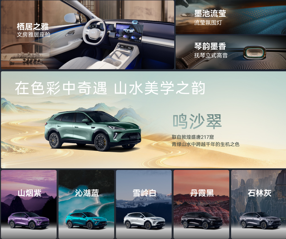 比如山烟紫、鸣沙翠、雪岭白这些车色,灵感分别取自黄山云海、敦煌青绿山水、梅里雪山。