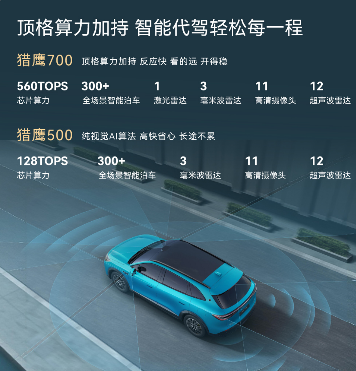智驾方面,猎鹰700智能辅助驾驶系统采用的是“一段式端到端”算法,硬件上配备了1颗激光雷达、3颗毫米波雷达、9个高清摄像头,芯片算力达到560TOPS。