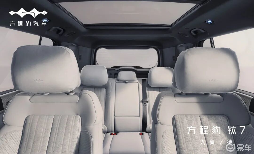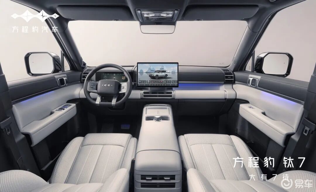 方程豹钛7的外观延续了“方盒子”的硬派造型,但未采用非承载式车身,而是承载式车身结构,更偏向城市驾驶的舒适性和燃油经济性,当然经典的外挂式小书包造型以及粗犷的保险杠让它看上去很唬人,长宽高分别为4999/1995/1865mm,轴距为2920mm,接近角/离去角分别为24/25度。内饰就不太硬派了,采用四辐式多功能方向盘、15.6英寸中控屏、12.3英寸仪表,配备4.5L的车载冷暖箱以及全车座椅加热/通风。动力搭载1.5T插混系统,其中发动机最大功率115kW,两驱版电机功率200kW,双电机四驱版为360kW,提供26.6kWh和35.6kWh电池组,CLTC纯电续航分为135km、190km、200km三种版本,满油满电综合续航超1300km,辅助驾驶方面提供DiPilot 100和带激光雷达的DiPilot 300(顶配)两种方案。