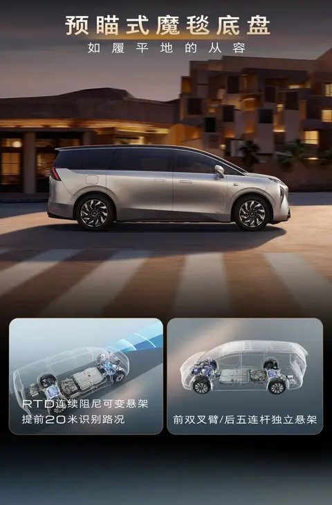 至境世家搭载别克全新“逍遥智行”高阶辅助驾驶系统,车头配有激光雷达,号称支持“无断点”城市 NOA、全类型泊车辅助等功能。新车首搭支持预瞄的“魔毯底盘”,硬件上包含前双叉臂后五连杆独立悬架、80mm 行程空气悬架,以及预瞄式 RTD 减震器,可做到提前 20 米识别减速带。