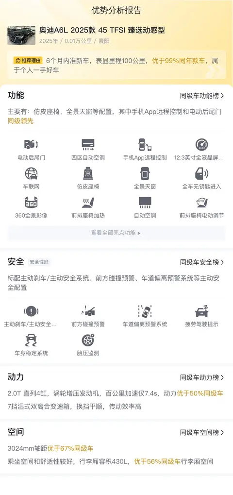 奥迪A6L 最低售价:29.95万起 最高降价:16.42万 图片 参数配置 询底价 懂车分4.12 懂车实测空间·性能等 车友圈65万 车友热议 二手车1.38万起 | 3389 辆今天给大家带来的这款奥迪A6L 2025款 45 TFSI 臻选动感型是一辆中大型4门5座三厢车,车源地是湖北襄阳,上牌时间是2025年10月,表显里程是100公里,新车指导价是45.49万,二手车报价是33.88万,车身颜色是黑色,过户次数是0次。