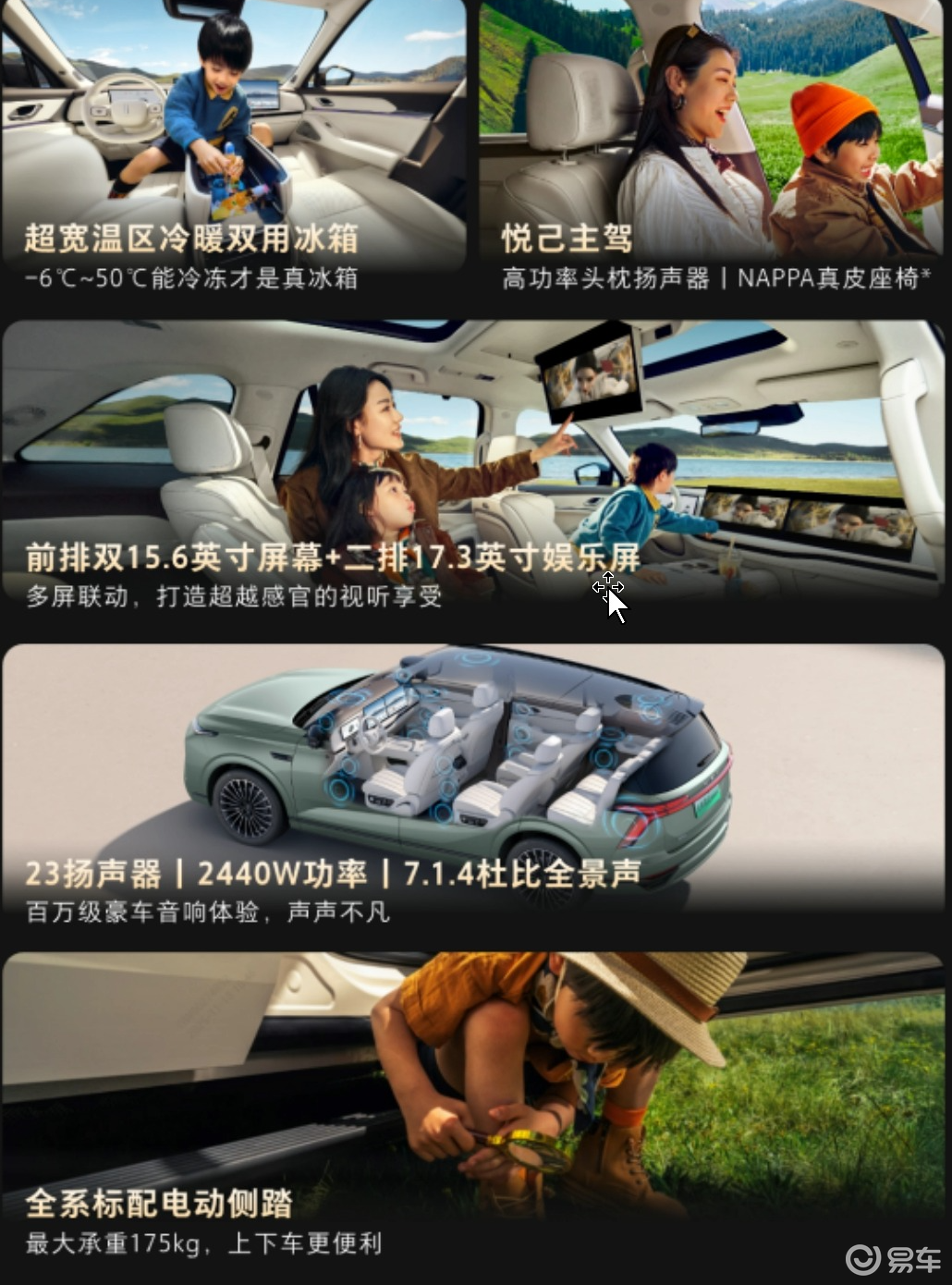 新车坚守“车内无主次”理念,践行舒适平权。主驾八点按摩、副驾一键零重力模式、二排带腿托“头等舱”座椅、成人可坐可躺的第三排,搭配-6℃至50℃的7L豪华大冰箱,让豪华体验覆盖每一位家人。