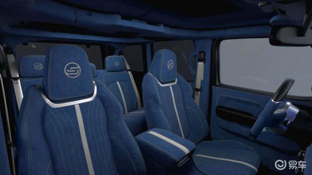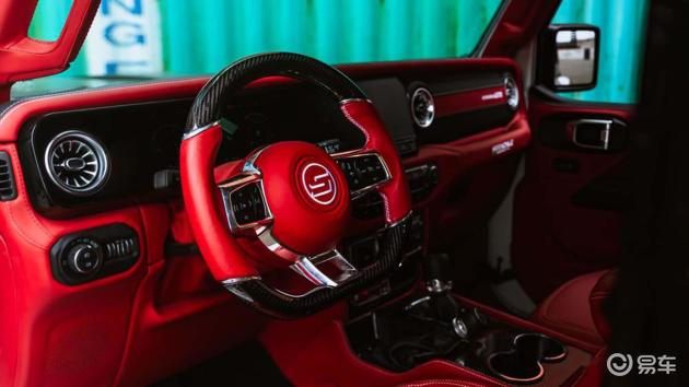 新车内饰彻底摆脱了工具车的属性,氛围相比原厂牧马人更加精致,采用了Nappa真皮、Alcantara翻毛皮和碳纤维装饰件的组合,座椅部分配有醒目的绗缝图案,整体触感与视觉效果更加高级、现代。信息娱乐系统、音响系统及驾驶辅助系统也经过深度定制与强化。同时,新车的官图暗示,无论是内饰还是外观,都可以根据客户个人喜好进行高度个性化定制。