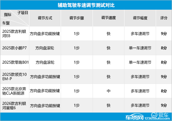 在辅助驾驶车速调节测试对比中,6款车型的整体表现基本符合预期。虽然调节方式存在差异,但在调节步骤方面均表现一致。需要注意的是,奔驰CLA新能源的调节速度略慢于其他车型。而在调节幅度方面,小鹏P7和零跑B01不支持多车速调节,因此出现失分情况。