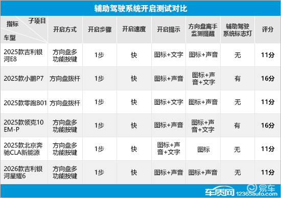 在辅助驾驶系统开启测试对比中,2025款小鹏P7(以下简称:小鹏P7)和2025款零跑B01(以下简称:零跑B01)采用方向盘拨杆开启,其余车型均采用方向盘多功能按键开启。开启步骤方面,6款车型均只需1步,并且开启速度快,日常使用便捷。开启提示方面,仅2025款北京奔驰CLA新能源(以下简称:奔驰CLA新能源)提供三种提示方式,其余车型均为两种提示方式。此外,6款车型均配备方向盘离手监测提醒功能,除奔驰CLA新能源仅支持图标提醒外,其余车型都具备两种及以上提醒方式。值得一提的是,小鹏P7和2025款领克10 EM-P(以下简称:领克10 EM-P)还配备了辅助驾驶系统标志灯,能够为其他道路参与者提供明显提示。