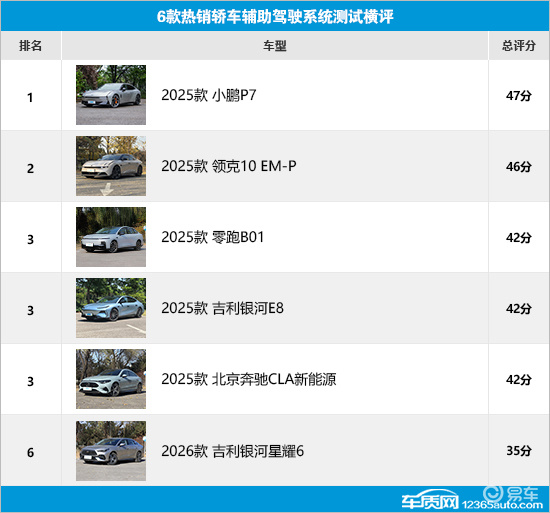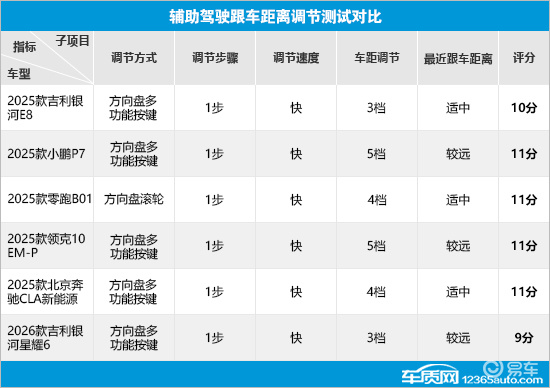 在辅助驾驶跟车距离调节测试对比中,6款车型的调节步骤均为1步,且调节速度表现出色。不过在车距调节方面,小鹏P7和领克10 EM-P支持5档车距调节,而2025款吉利银河E8(以下简称:银河E8)和2026款吉利银河星耀6(以下简称:银河星耀6)两款吉利银河品牌车型则表现一般,仅支持3档车距调节。此外,在最近跟车距离方面,小鹏P7、领克10 EM-P和银河星耀6测试成绩不太理想。