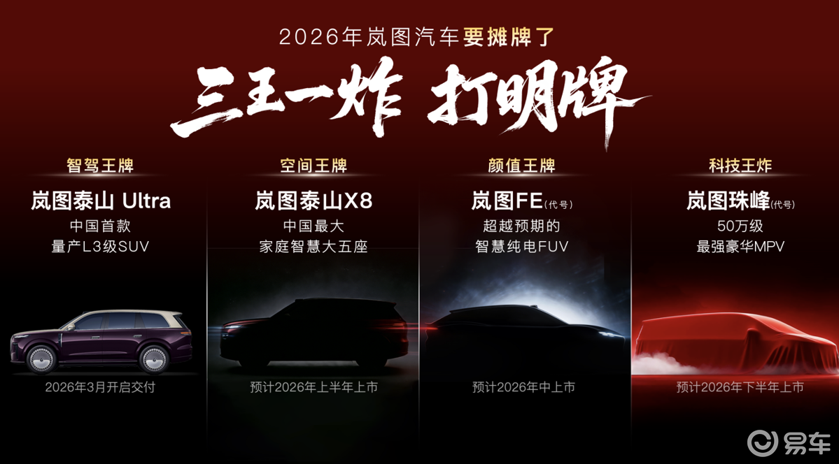 此次岚图发布的四款新车各有侧重,精准覆盖不同用户群体的核心需求,由岚图汽车CBO、销售公司总经理邵明峰亲自揭晓定位:岚图泰山Ultra化身“智驾王牌”,岚图泰山X8扛起“空间王牌”,代号FE的全新FUV主打“颜值王牌”,而代号“珠峰”的MPV则堪称“科技王炸”。值得关注的是,全系新车均搭载L3级智能辅助驾驶硬件,在驾控、智能、豪华三大维度全面升级,将为市场带来全方位的惊喜,成为岚图2026年提升市场份额、强化用户口碑的核心抓手。
