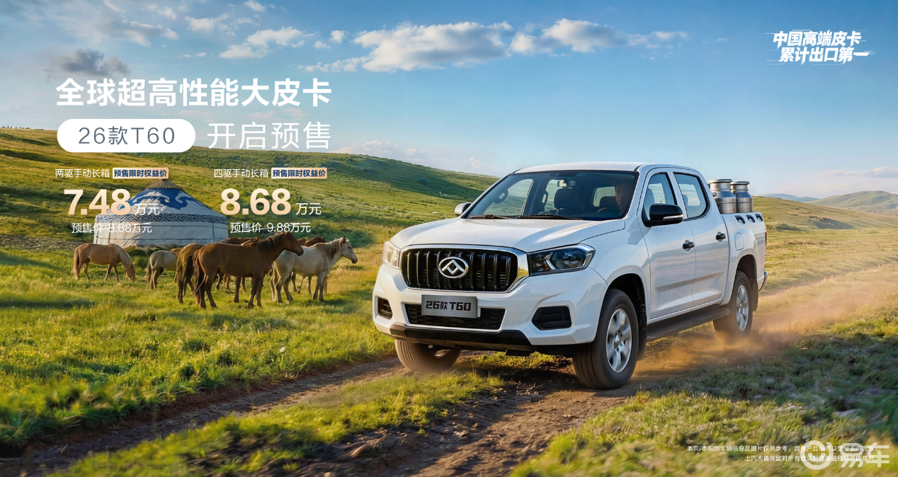 26款T60则是不容小觑的“实力创富王”,凭借同级最大空间、同级最强动力、同级最强安全等核心优势,为务实创富群体打造可靠出行搭档。空间层面,新车拥有1.45m³同级最大货箱容积,额定载重领先同级80%,搭配965mm同级最大二排腿部空间,既能高效承载重载货物,也能保障乘坐舒适性,实现载人拉货两不误;动力层面,新车搭载行业唯一获评“中国心”十佳的上汽π2.0T柴油发动机,以120kw最大功率、410N・m峰值扭矩拿下同级动力双第一,更配备行业唯一的DPF无感自洁再生技术,动力充沛且用车经济省心,轻松应对爬坡过坎等复杂路况;安全层面,新车遵循ANCAP五星安全设计标准,采用行业唯一的激光焊接工艺,车身高/超高强度钢占比达70%(行业第一),以硬核安全品质为创富之路筑牢根基。