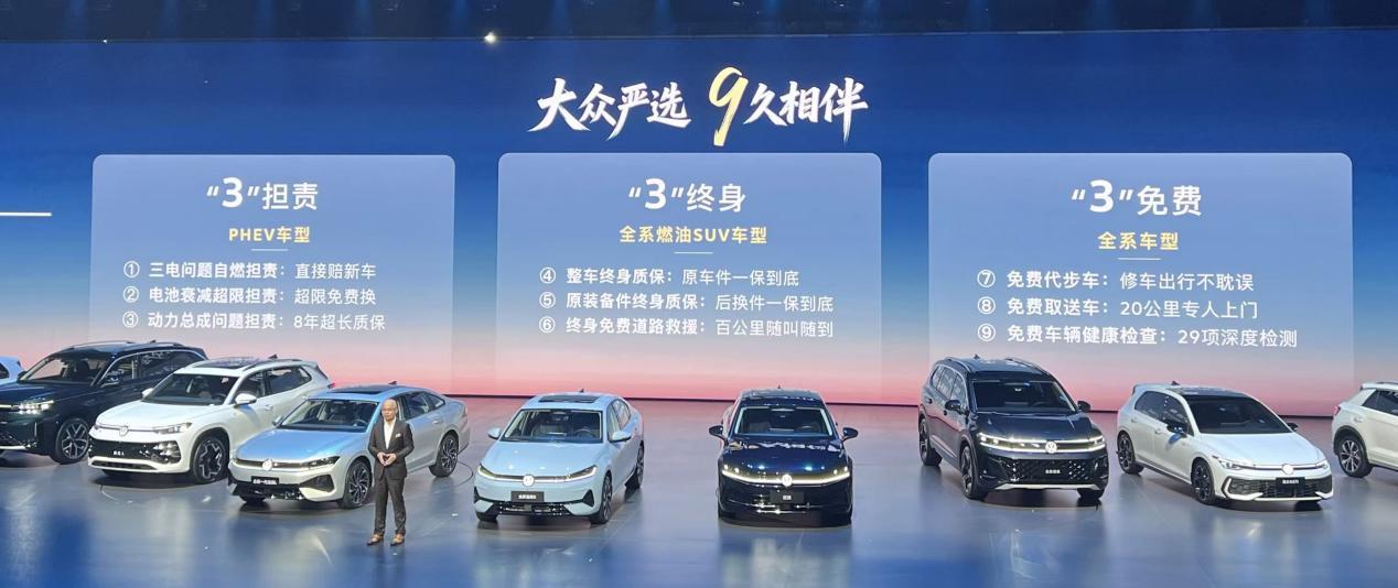 油电混共进的背后,是一汽-大众对市场真实需求的尊重,也是新能源时代合资车企反攻的另一个案例。而更值得一提的是这次官方推出的“大众严选9久相伴”服务政策——三担责,三终身、三免费。PHEV的三电出了问题,厂家担责甚至换新车;燃油SUV整车终身质保、终身救援、终身原装备件。全系车型维修期间免费代步车、免费取送车。