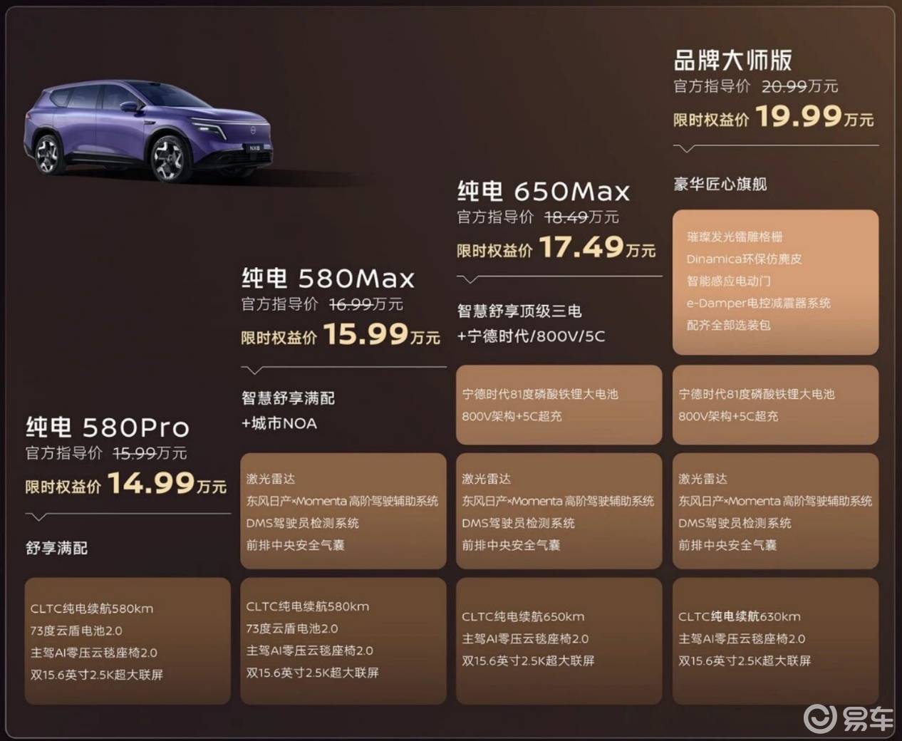 纯电580 Max售价15.99万,价格贵了1万,续航和电池没有变化,增加的配置跟增程150 Max一样,主要升级是在辅助驾驶方面,支持高速NOA、城市NOA和全场景自动泊车。这一配置适合想要纯电又想要辅助驾驶的用户。