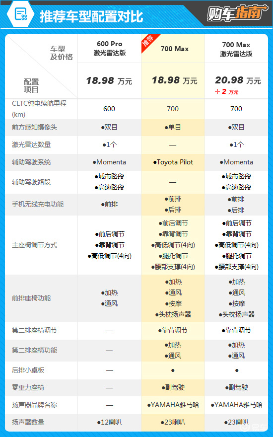 根据配置对比不难发现,600 Pro激光雷达版与推荐车型价格一致,前者虽然辅助驾驶功能占优,但舒适性配置缺失较多,鉴于现阶段辅助驾驶功能的体验参差不齐,相比之下推荐车型更有优势。